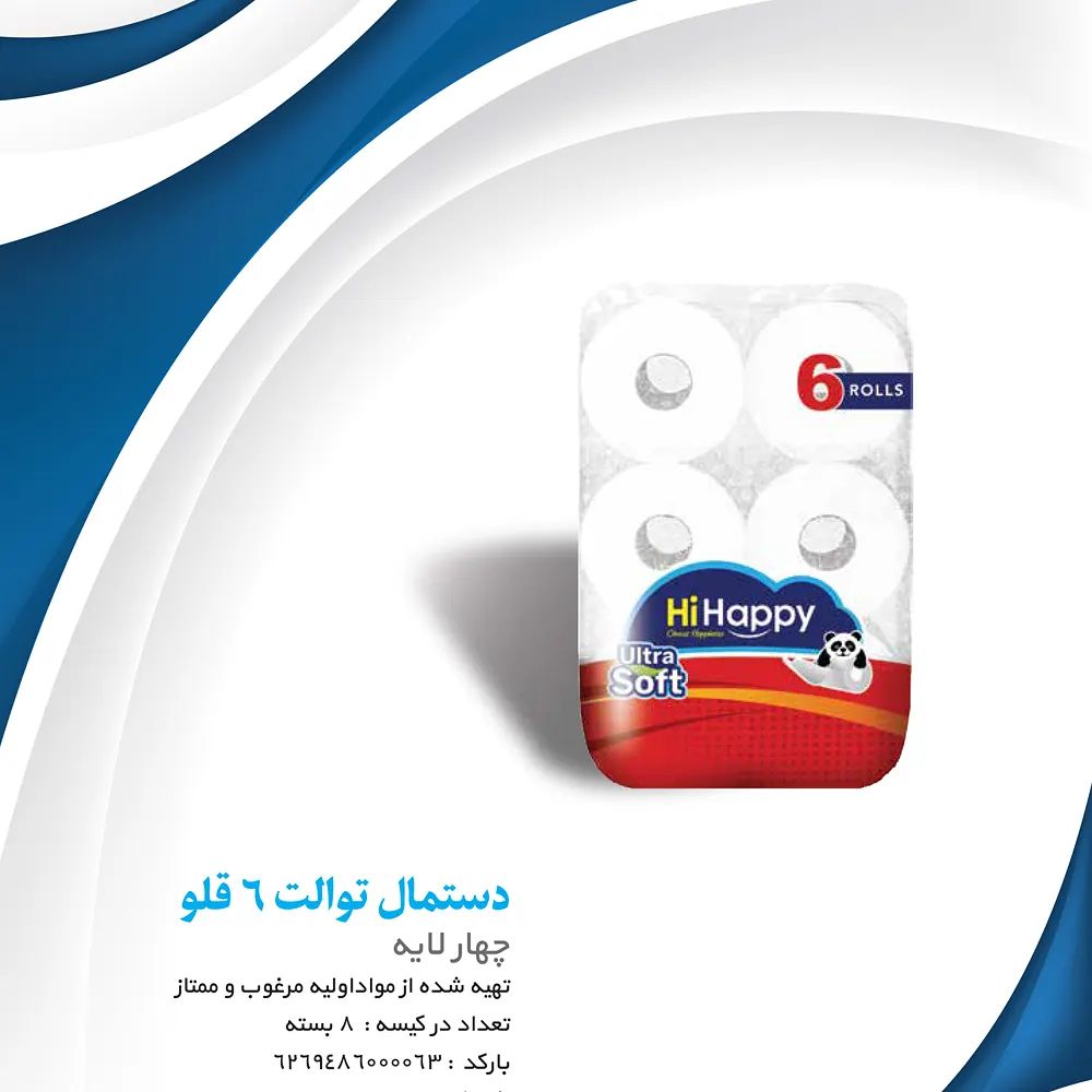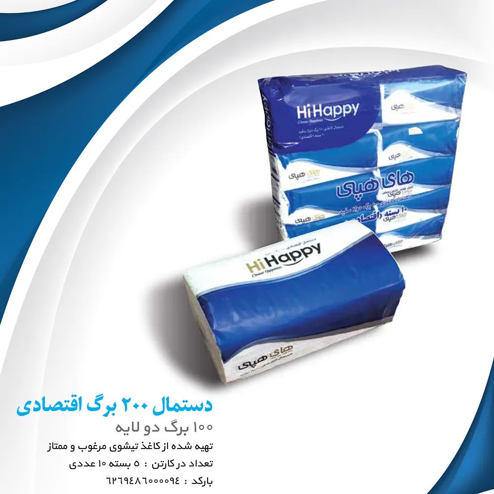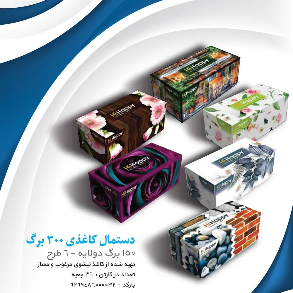 محصولات های هپی از تیشوی درجه یک تهیه شده و فرایند تولید آن با استفاده از دستگاه های تمام اتوماتیک و بصورت کاملا بهداشتی می باشد . دستمال کاغذی یکی از موارد بهداشتی است که هر فرد برای حفظ بهداشت و سلامتی خود روزانه مصرف زیاد دارد امروزه با توجه به مصرف بالا دستمال کاغذی دربازار دستمال های بارنگ های مختلف ، عطری و کیفیت های متفاوت وجود دارد که انتخاب را برای مصرف کننده دشوار می کند به طوری که نکات بهداشتی که باید در خرید دستمال رعایت شود نادیده گرفته می شود در صورت استفاده از دستمال غیر بهداشتی امکان ابتلا به بیماری های خطر ناک زیاد می شود. این دستمال ها دارای 4 لایه دستمال با قدرت جذب آب بالا ، ضد حساسیت می باشد که بدون هیچ گونه رنگ و فاقد هرگونه مواد حساسیت زا تولید شده. ویژگی های این برند :بافت نرم سبک و حجیم شده قدرت جذب بالا کیفیت عالی تنوع تولید برند های هپی دستمال فله 200برگ Hi Happy اقتصادی (10 عددی) دلسی دوقلو چهار لایه Hi Happy دستمال کاغذی 200برگ Hi Happy ( کلاسیک) دستمال کاغذی 200برگ Hi Happy طرح ( 4 طرح ) دستمال کاغذی 300برگ Hi Happy طرح ( 6 طرح ) دلسی چهارقلو چهار لایه Hi Happy دلسی دوازده قلو چهارلایه Hi Happy دستمال حوله دوقلو چهارلایه Hi Happy دلسی شش قلو چهار لایه Hi Happy